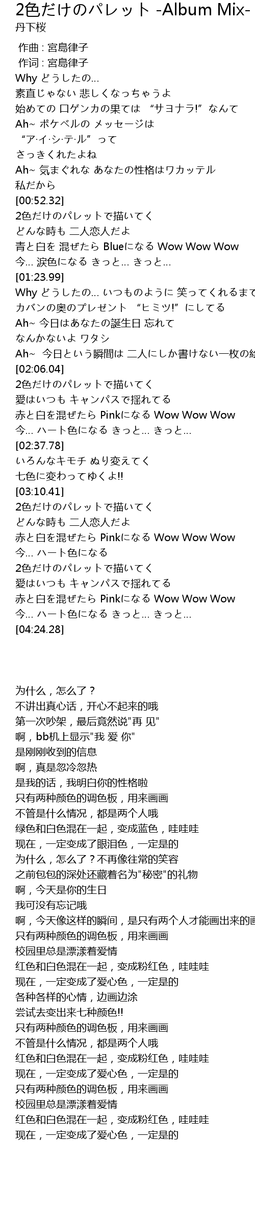 | [03:41.08] | 赤と白を混ぜたら Pinkになる Wow Wow Wow |