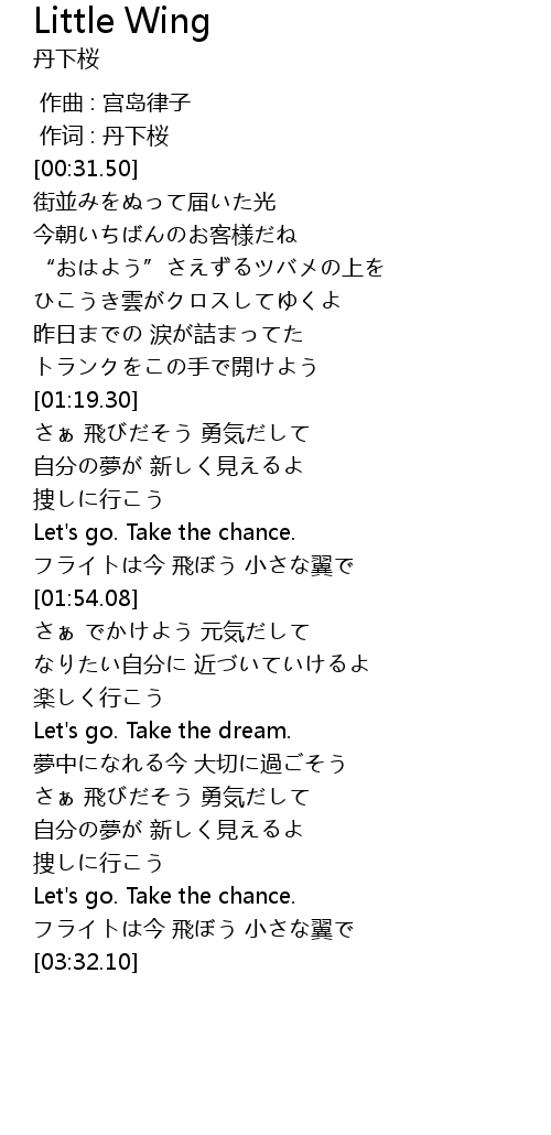 | [03:22.47] | フライトは今 飛ぼう 小さな翼で |