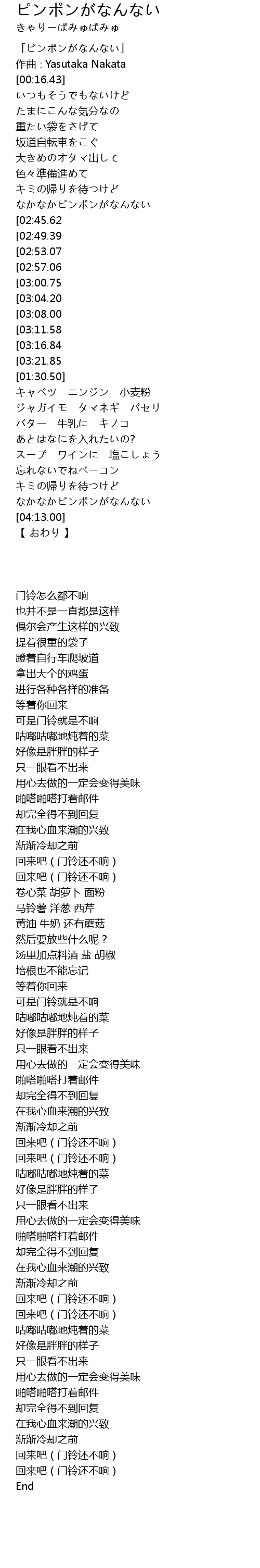| [04:01.92][03:16.84][02:33.65][01:20.28] | 帰ってきてね (ピンポンなんない) |