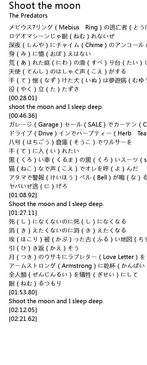 | [00:14.63] | 深夜(しんや)にチャイム(Chime)のアンコール(Encore) |