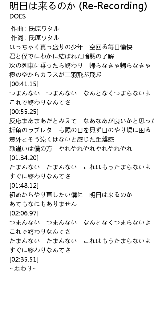 | [01:54.67] | 初めからやり直したい僕に 明日は来るのか |