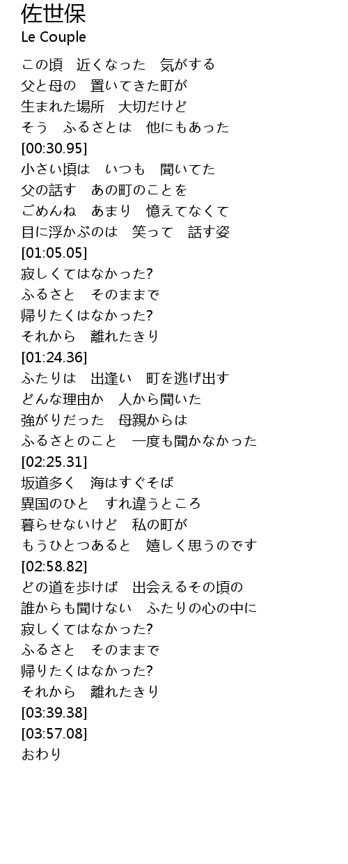 | [01:56.60] | ふたりは 出逢い 町を逃げ出す |