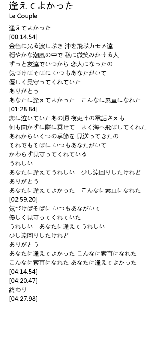 | [03:59.53] | こんなに素直になれた あなたに逢えてよかった |