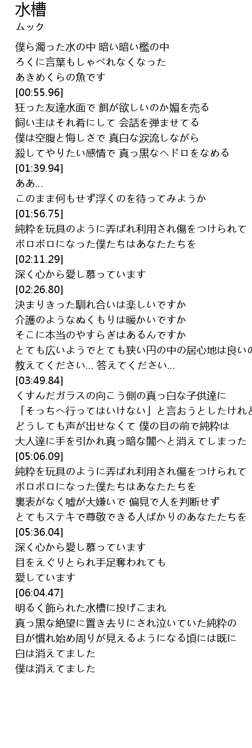 | [00:38.89] | 僕ら濁った水の中 暗い暗い檻の中 |