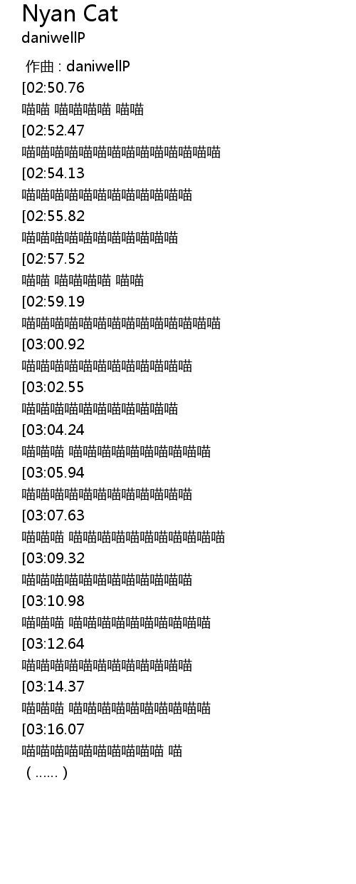 | [03:43.11][03:16.07][02:49.06][02:22.01][01:55.00][01:27.93][01:00.89][00:33.85] | 喵 喵喵喵喵喵喵喵喵喵喵 喵 |