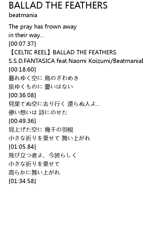 | [00:11.19] | 【CELTIC REEL】BALLAD THE FEATHERS |