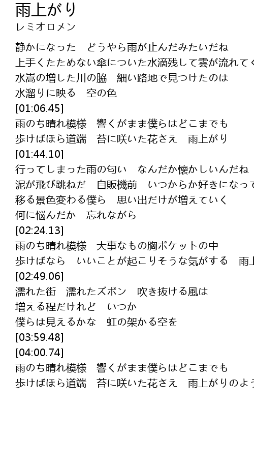 | [01:06.70] | 雨のち晴れ模様 響くがまま僕らはどこまでも |