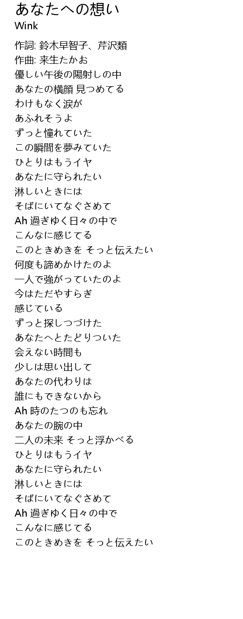 | [00:01.000] | 作詞: 鈴木早智子、芹沢類 |
