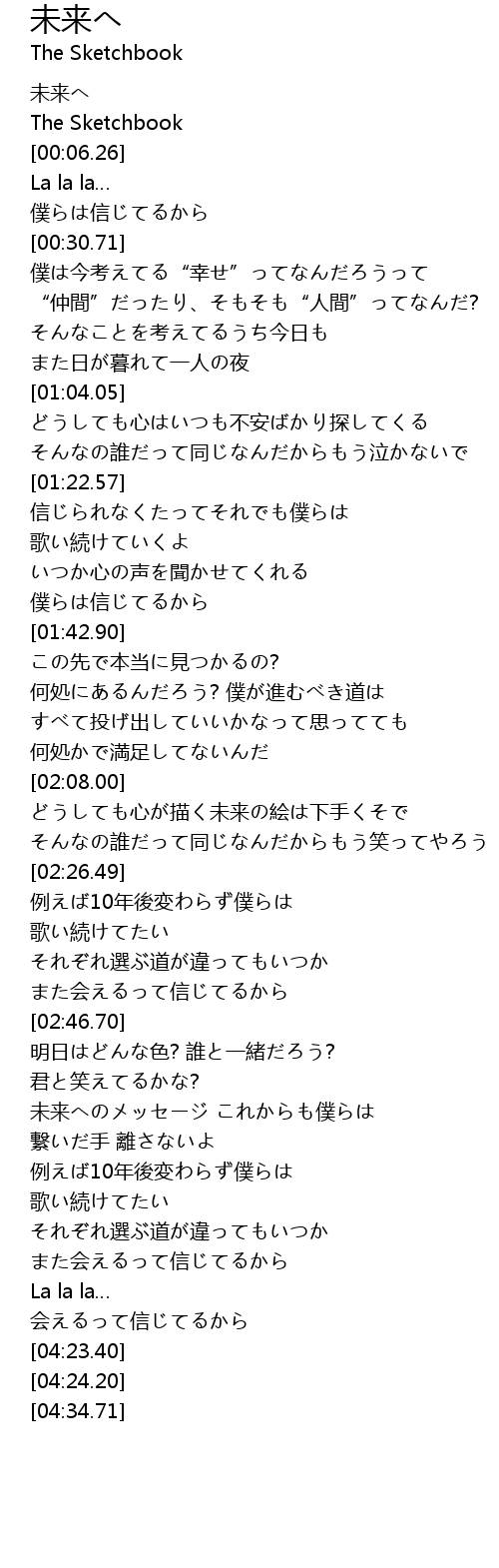| [03:17.02] | 未来へのメッセージ これからも僕らは |