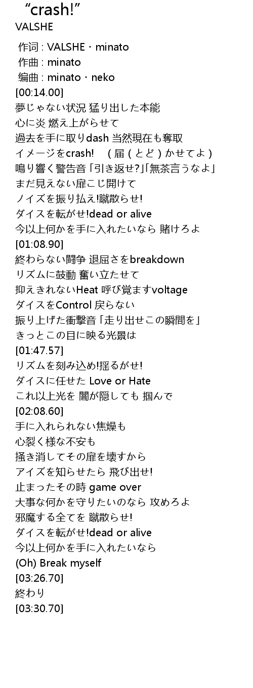 | [00:31.61] | 鳴り響く警告音 「引き返せ?」「無茶言うなよ」 |