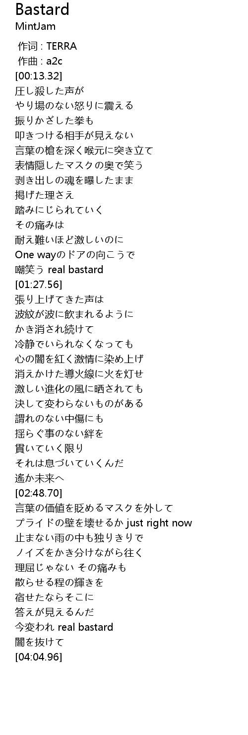 | [03:56.96] | 今変われ real bastard |