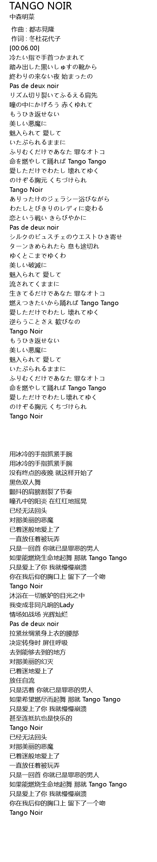 | [01:19.03] | 命を燃やして踊れば Tango Tango |