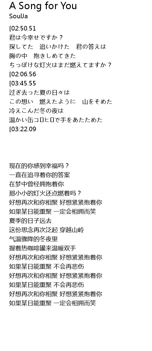 | [01:01.25][02:06.56][03:11.72][03:35.20] | また会いたいよ 抱きしめたいよ |