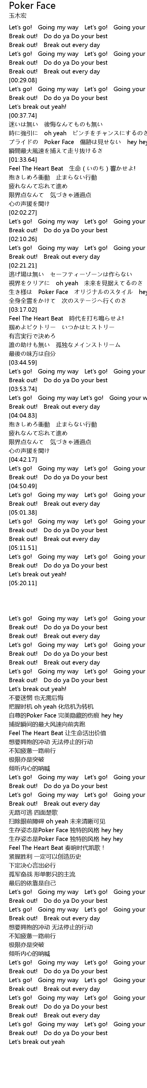 | [03:00.00] | 生き様は Poker Face オリジナルのスタイル hey hey |