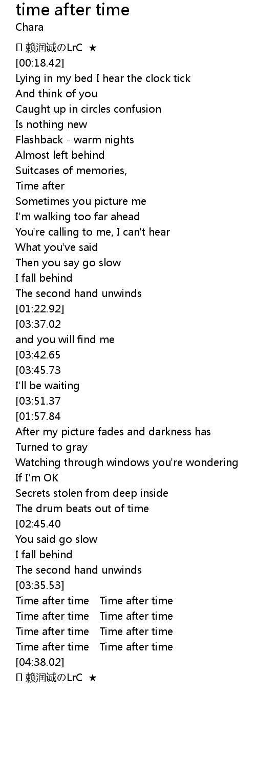 | [04:08.88][03:51.37][03:00.25][01:54.85][01:37.32] | Time after time |