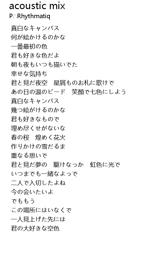 | [03:15.235] | 君と見だ夢の 駆けなっか 虹色に光で |