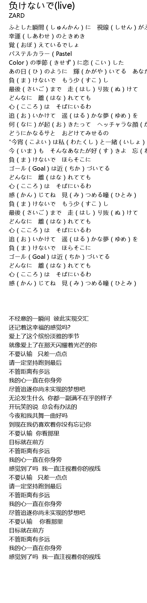 | [03:02.03] | 負(ま)けないで ほらそこに |