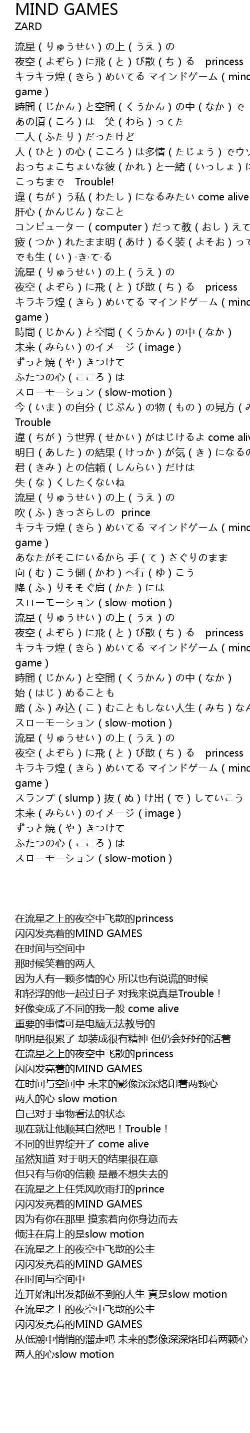 | [00:23.47] | キラキラ煌(きら)めいてる マインドゲーム(mind game) |