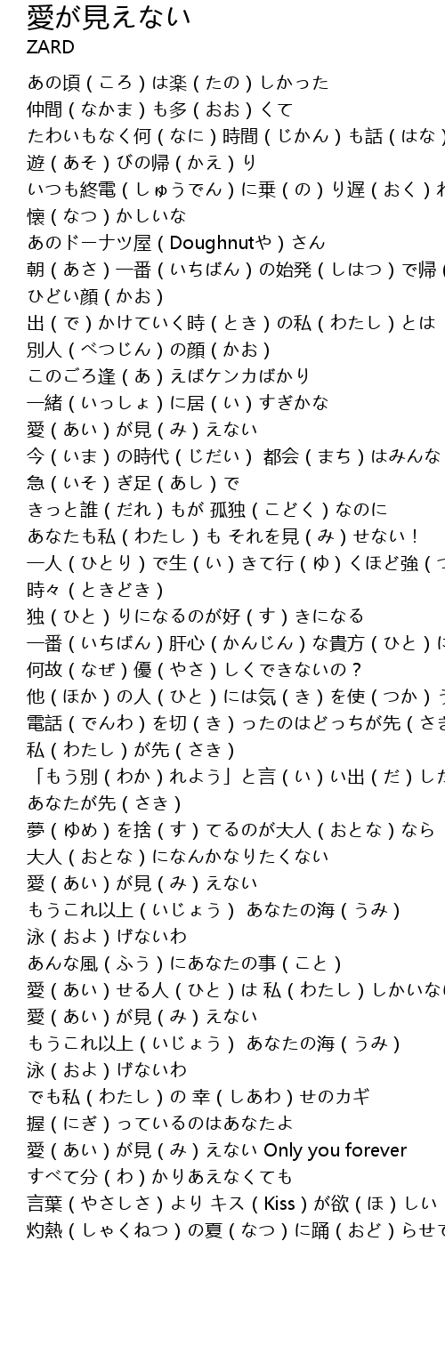 | [03:06.21] | 愛(あい)が見(み)えない Only you forever すべて分(わ)かりあえなくても |