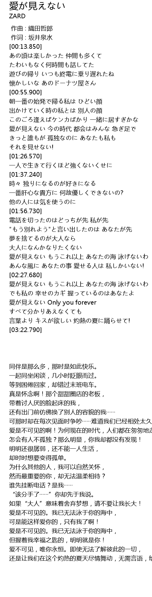 | [03:07.330] | 愛が見えない Only you forever すべて分かりあえなくても |