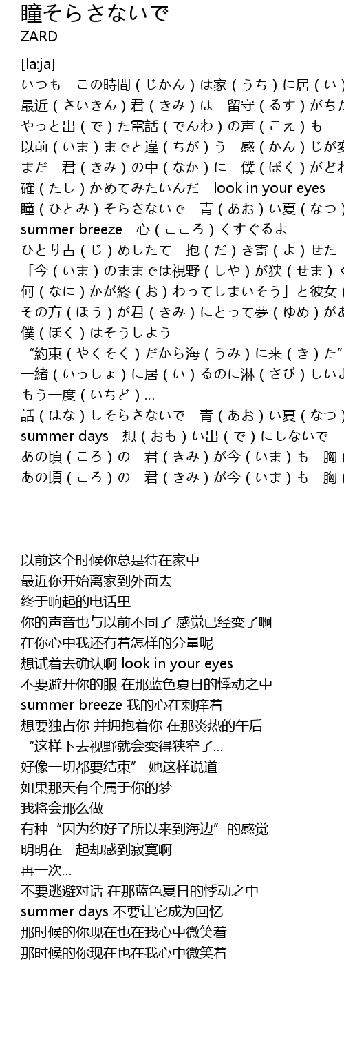 | [01:35.99] | 瞳(ひとみ)そらさないで 青(あお)い夏(なつ)のトキメキの中(なか)で |