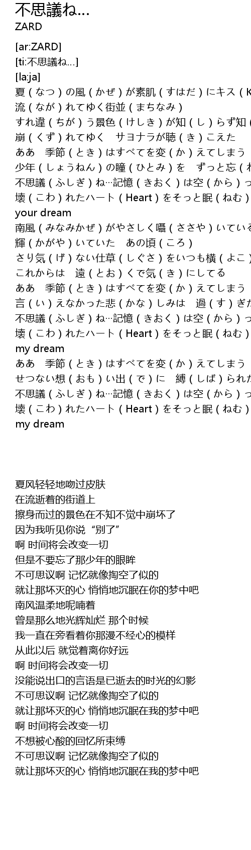 | [03:18.39] | 不思議(ふしぎ)ね···記憶(きおく)は空(から)っぽにして |
