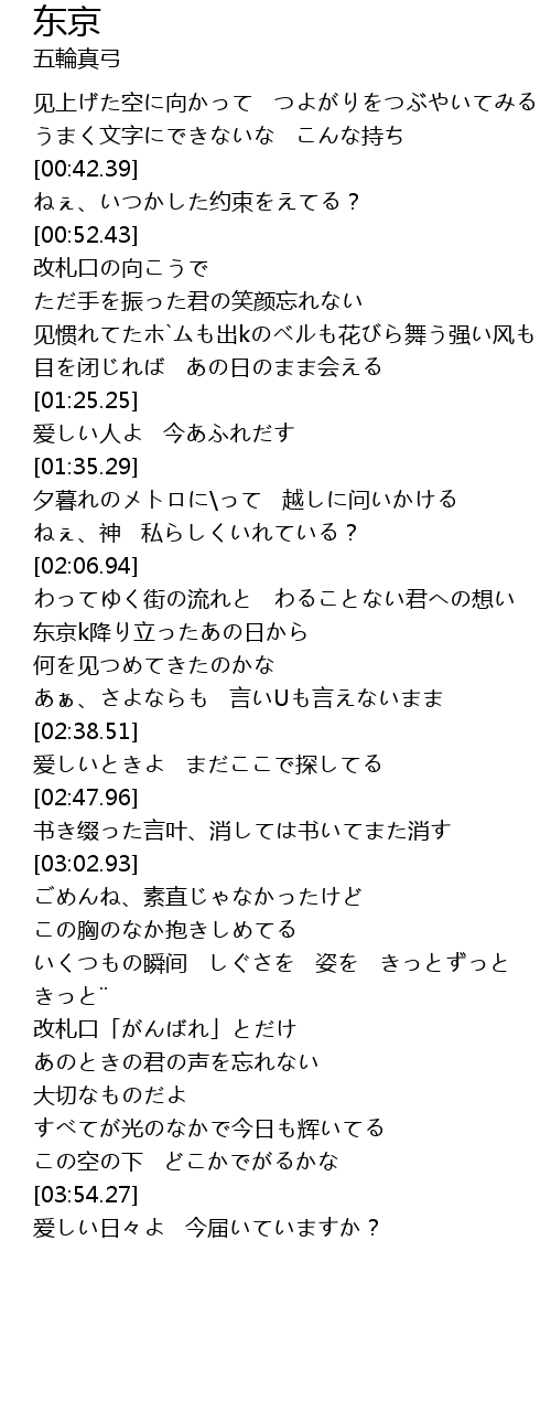 | [02:18.74] | 东京k降り立ったあの日から 何を见つめてきたのかな |