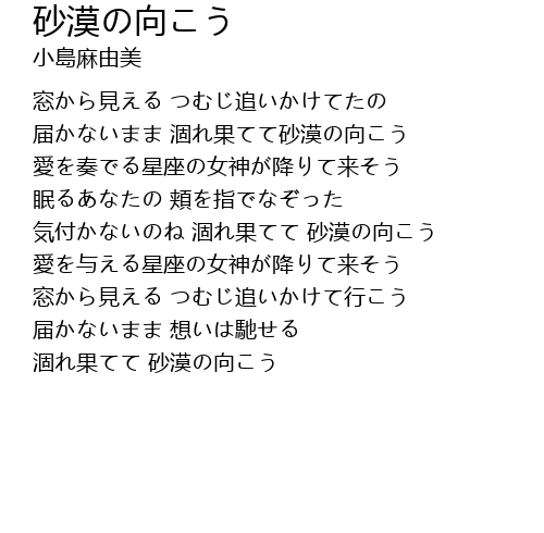 | [00:18.180] | 届かないまま 涸れ果てて砂漠の向こう |
