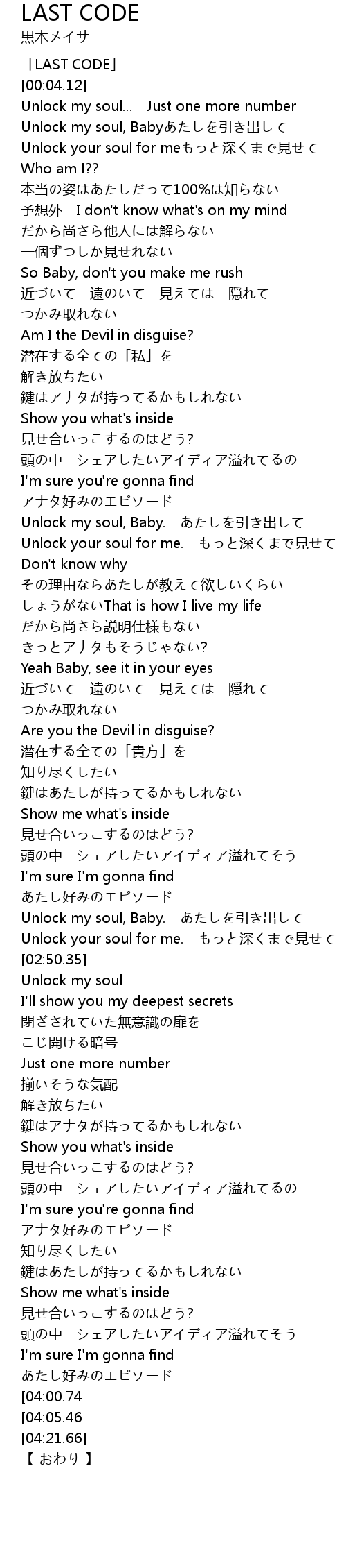 | [04:15.39][04:05.46] | Unlock your soul for me. もっと深くまで見せて |