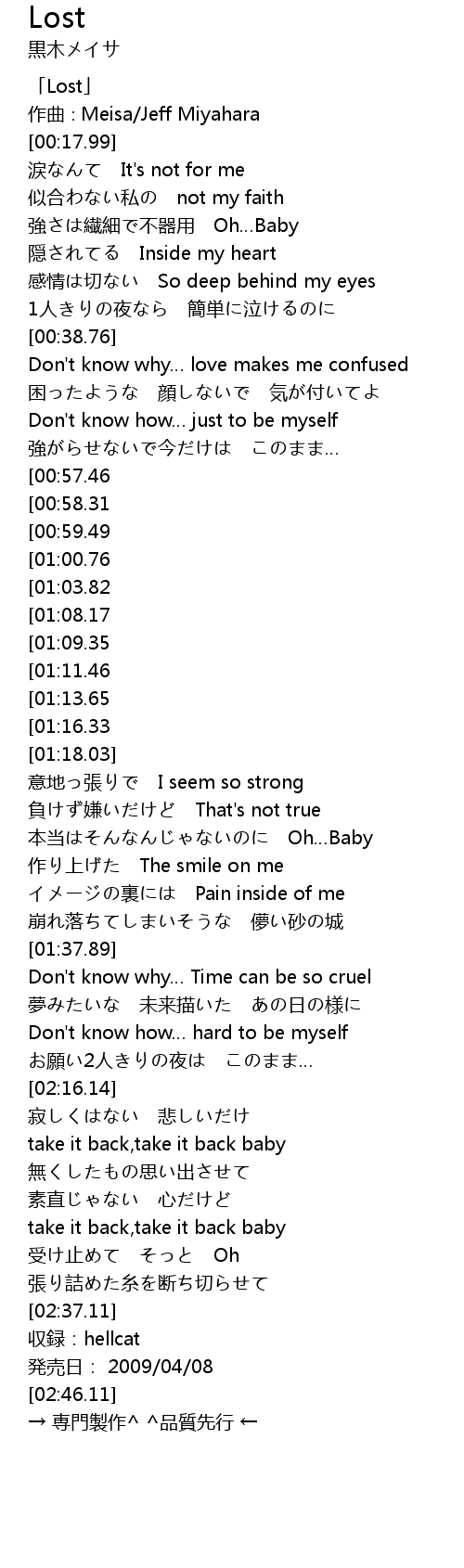 | [00:11.99] | zuo qu Meisa Jeff Miyahara |