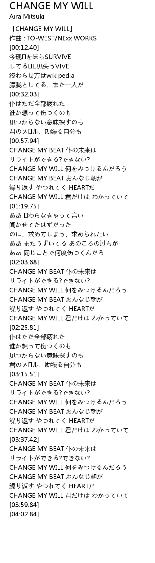 | [03:38.15] | CHANGE MY BEAT 仆の未来は |