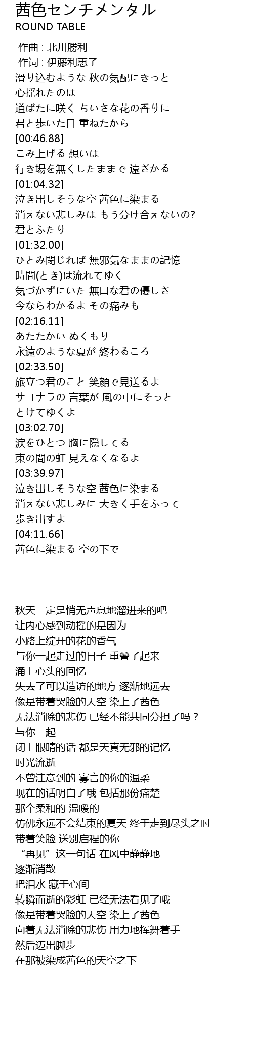 | [00:11.29] | 滑り込むような 秋の気配にきっと |