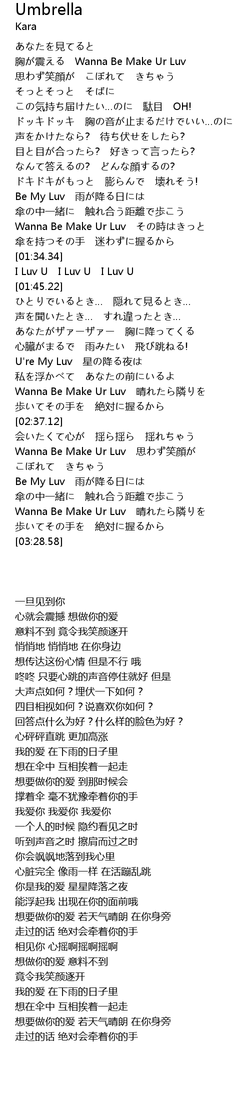 | [01:17.01] | 傘の中一緒に 触れ合う距離で歩こう |