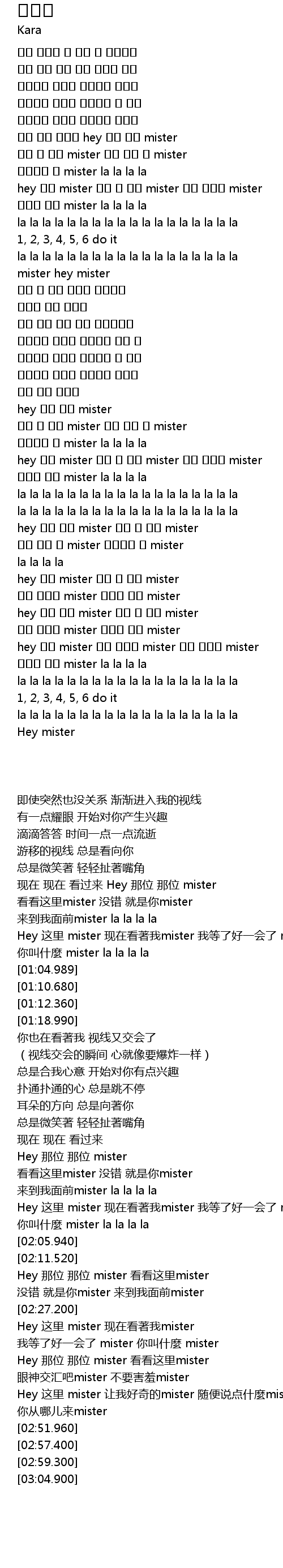 | [02:30.460] | 한참 바랬어 mister 이름이 뭐야 mister |