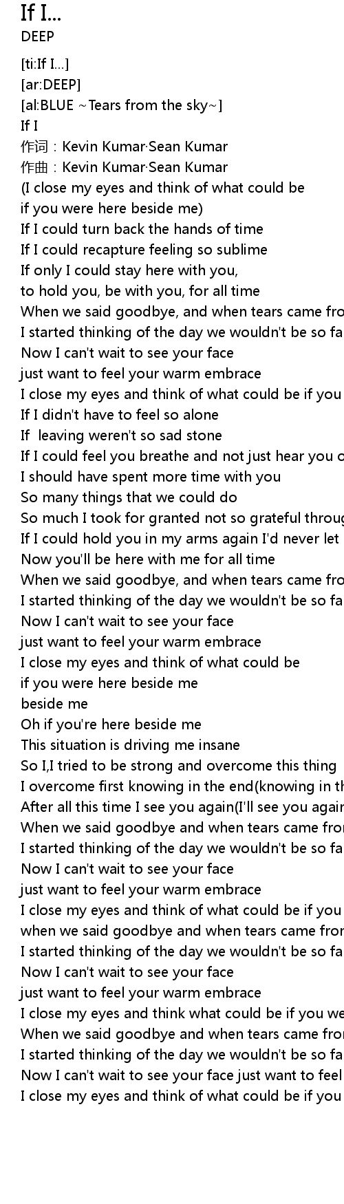 | [03:46.15] | I close my eyes and think what could be if you were here beside me |