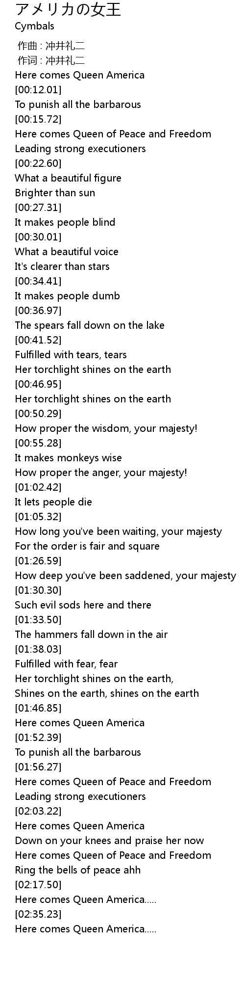 | [02:10.95] | Here comes Queen of Peace and Freedom |