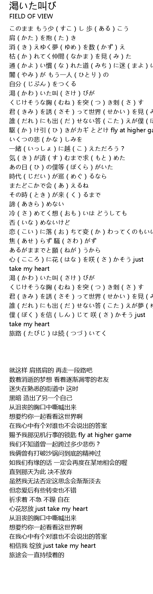| [01:17.100] | 駆(か)け引(ひ)きがカギ とどけ fly at higher game |