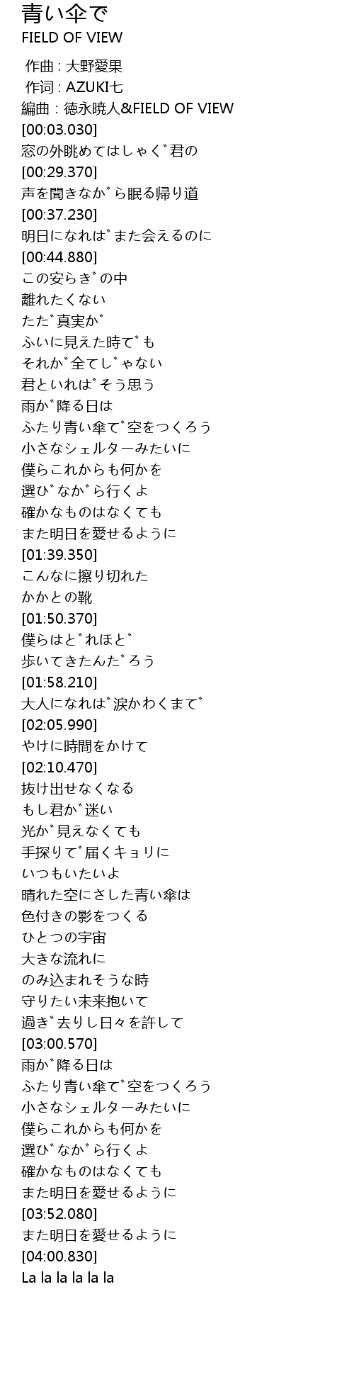 | [03:23.200] | ふたり青い傘で空をつくろう |