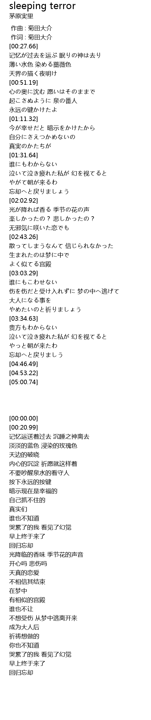 | [00:30.80] | 记忆が过去を运ぶ 眠りの神は去り |