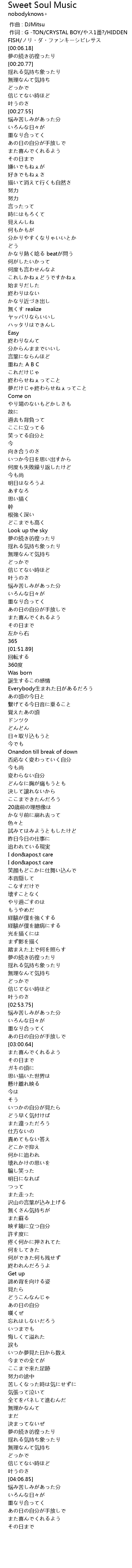 | [00:01.00] | 作词 : G -TON/CRYSTAL BOY/やス1番?/HIDDEN FISH/ノリ・ダ・ファンキーシビレサス |
