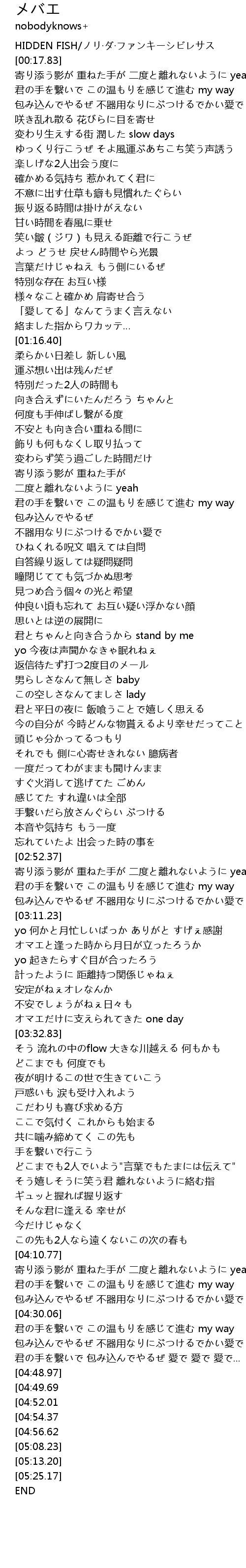 | [00:09.83] | HIDDEN FISH/ノリ·ダ·ファンキーシビレサス |