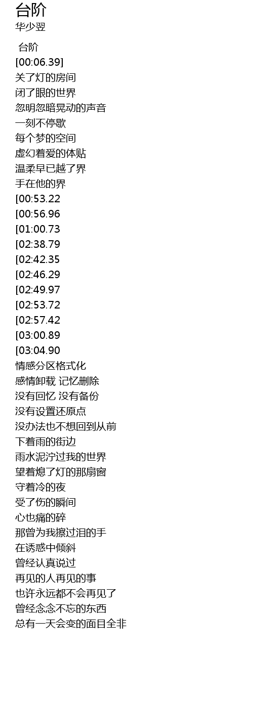 | [03:23.12][02:53.72][01:23.80] | 我是被你踩痛的台阶 |