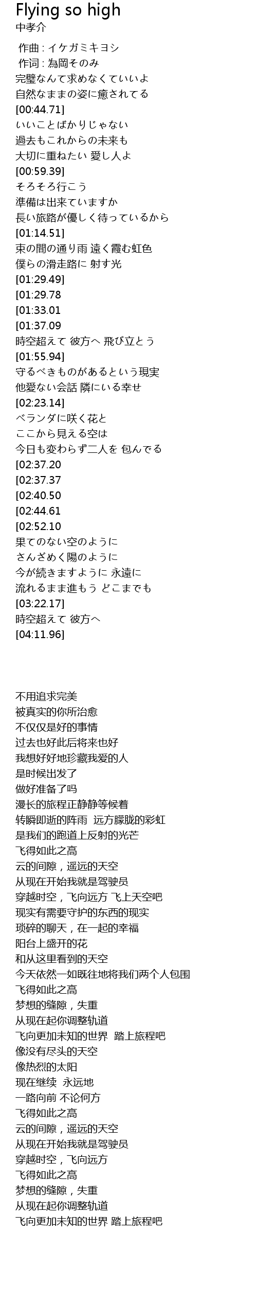| [03:22.47][01:29.78] | Flying so high |