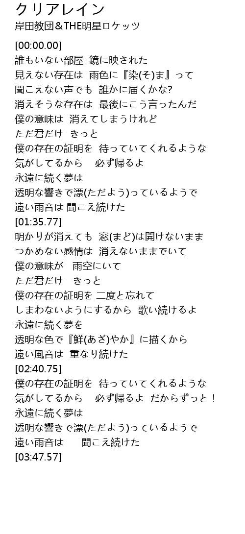 | [00:33.78] | 見えない存在は 雨色に『染(そ)ま』って |