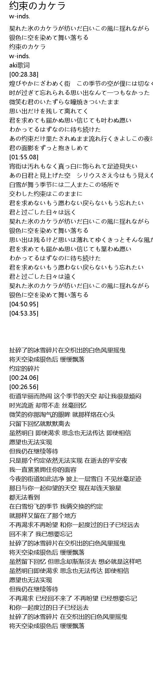 | [00:00.96] | 契れた氷のカケラが纺いだ白いこの風に揺れながら |