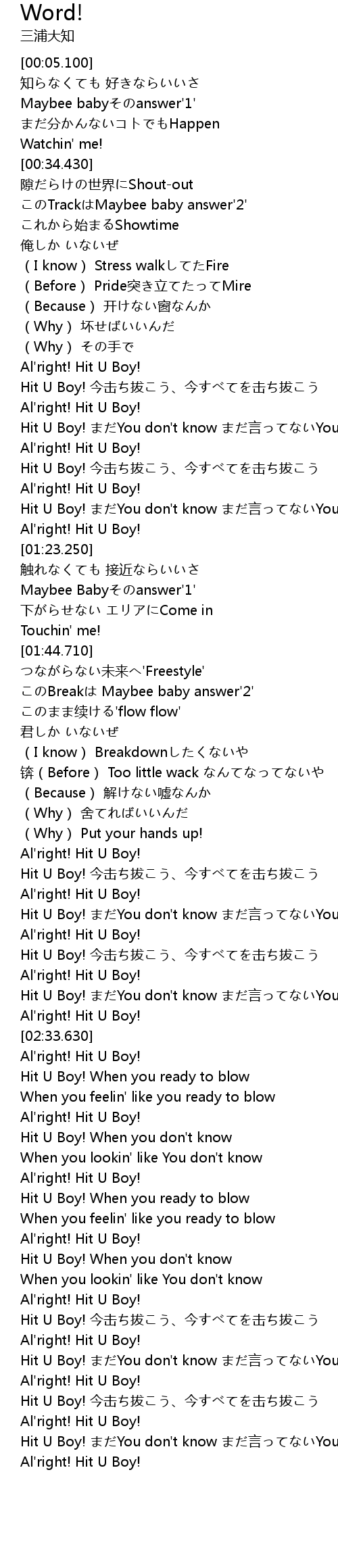 | [02:31.500] | Al' right! Hit U Boy! |