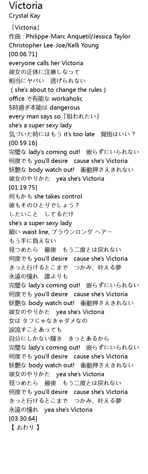 | [03:16.77] | 何度でも you'll desire cause she's Victoria |