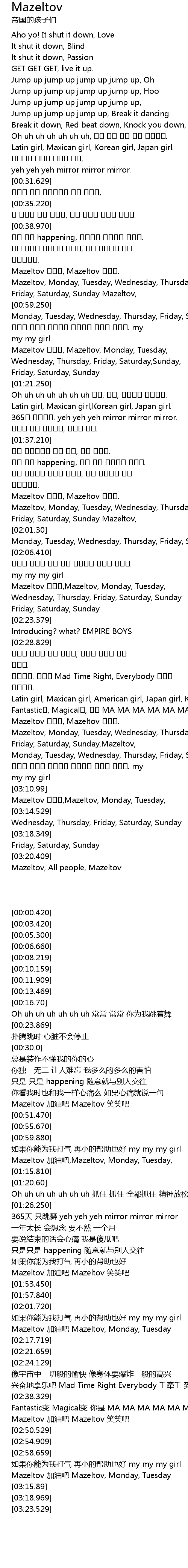 | [01:11.630] | Mazeltov 힘내봐, Mazeltov, Monday, Tuesday, |