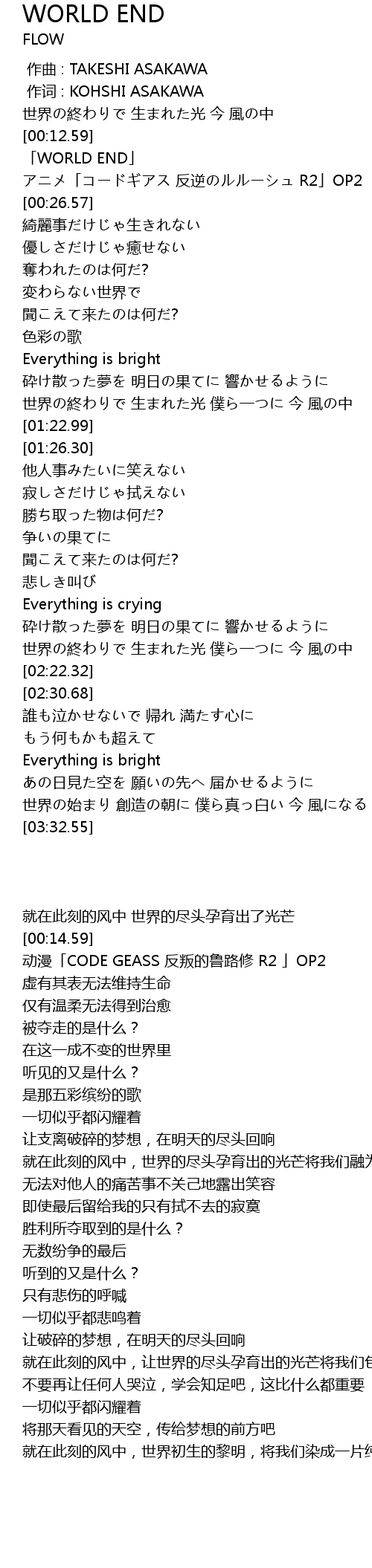 | [00:02.60] | 世界の終わりで 生まれた光 今 風の中 |