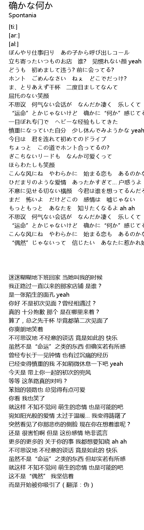 | [01:06.98] | “运命”とかじゃないけど 确かに“何か”感じてる |